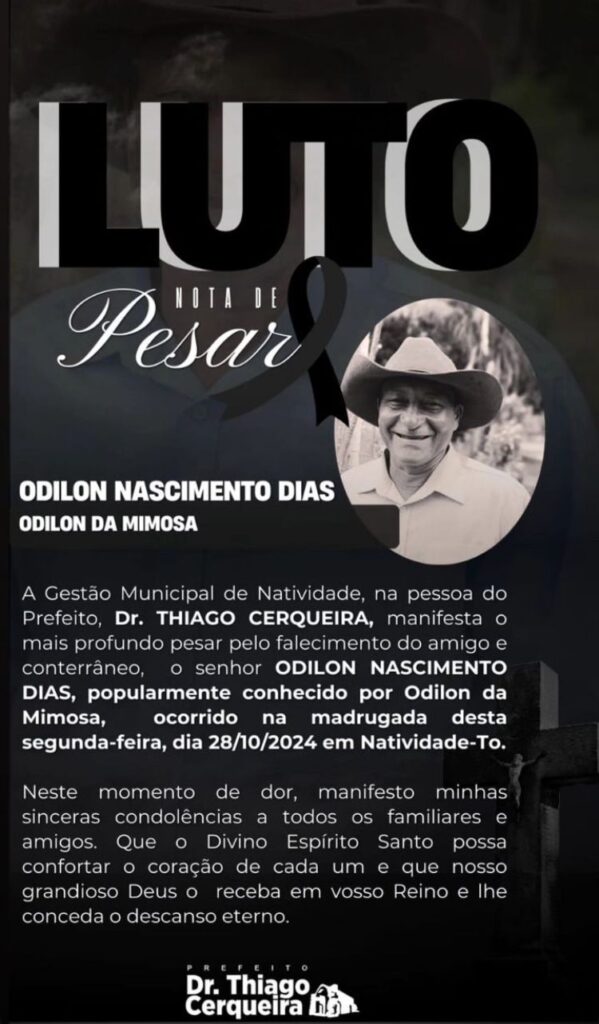 A Prefeitura de Natividade publicou nas redes sociais uma nota de pesar lamentando a morte do homem, que era conhecido na cidade como ‘Odilon da Mimosa’.