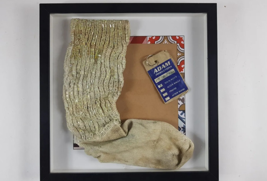 Bordado com cristais quadrados brilhantes, a meia foi emoldurada e acompanhada pelo “passe de acesso ao backstage da época” do técnico.