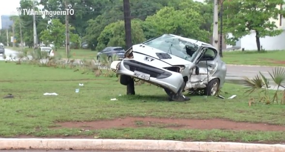 Mulher morre após carro capotar e ficar preso em coqueiro no canteiro de avenida de Palmas